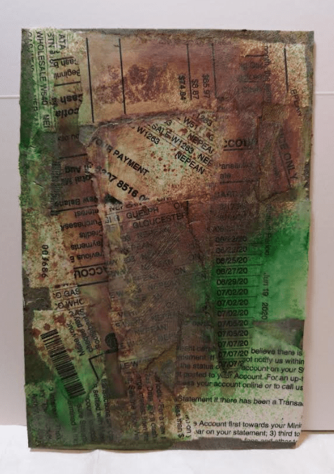 Ever wonder what to do with some of the mail you get. I have decided to use my MC statement to work on a mixed media piece. On the right is the first go round, the left is the second, now letting it dry. Will work on it more when I am back in the studio/office later today.