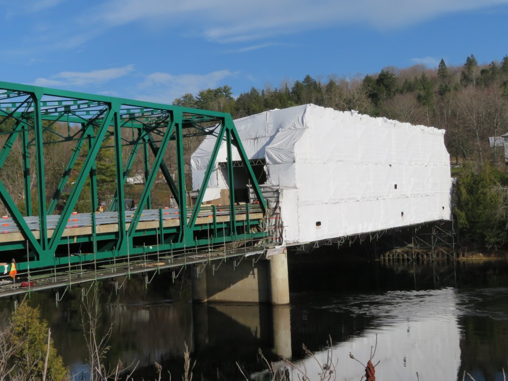 Looking for a covered bridge, found one.. just not in the state I expected to find it in. It is a bridge, and it is covered. =^_^=. We were over on the Quebec side today, no sitting in restaurants, had to order and take food out. We also discovered the deer hunting season has begun. (unhappy face)