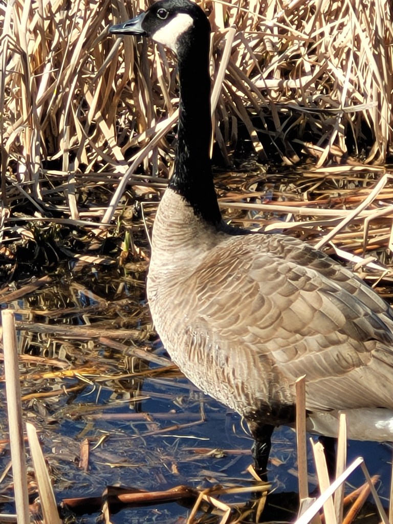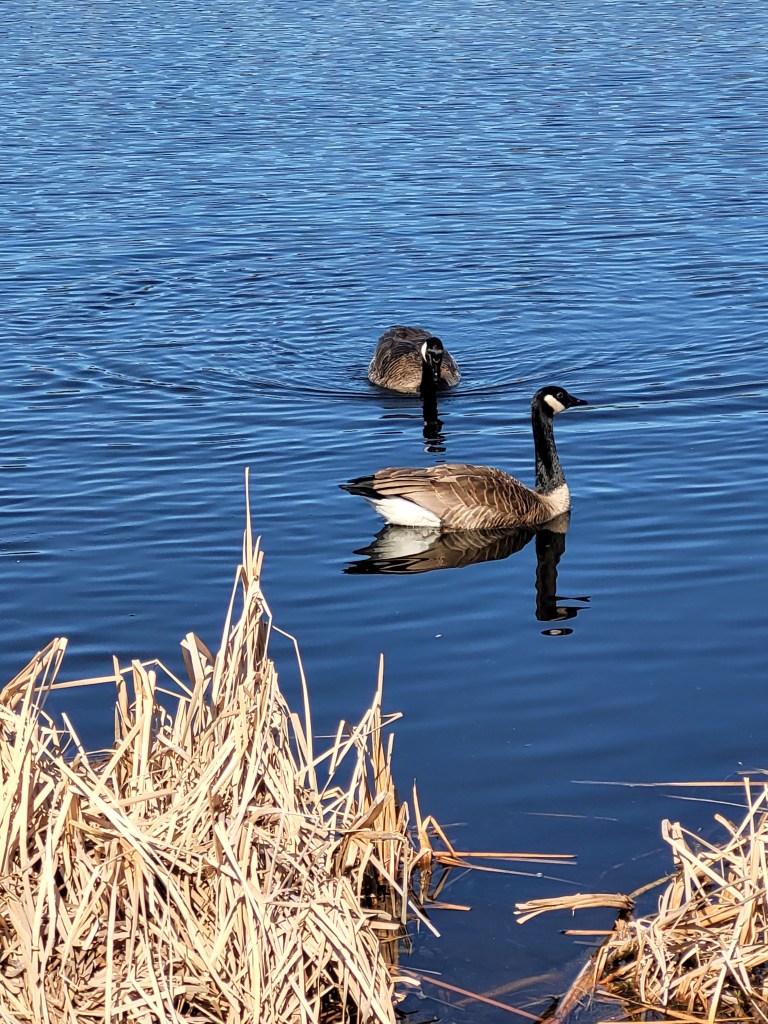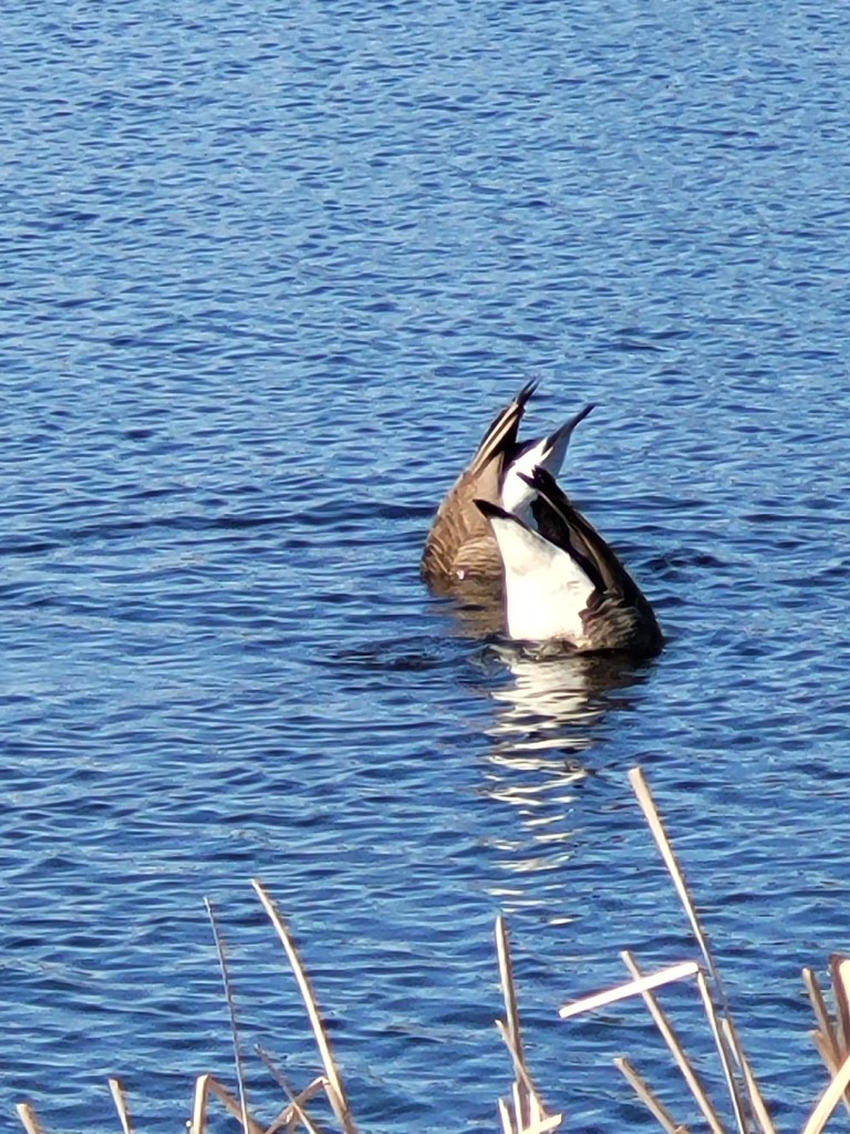 What can I say, I went out without a camera, the Nikon and the Canon were left hanging on their hooks… never even entered my mind to have them with me. Then I found myself alone in the sun with two Canada Geese who were happy to spend time with me preening and dining. I got to see the underside of the bird as it dived down to forage from the lake bed. No camera and none of my photographer friends in sight. Thankfully I had my cell (Samsung) so I did manage a couple of pictures, and I took a couple of videos.. however, I have no idea how to transfer them from the phone to my PC… eventually.. I’ll get there. =^_^=