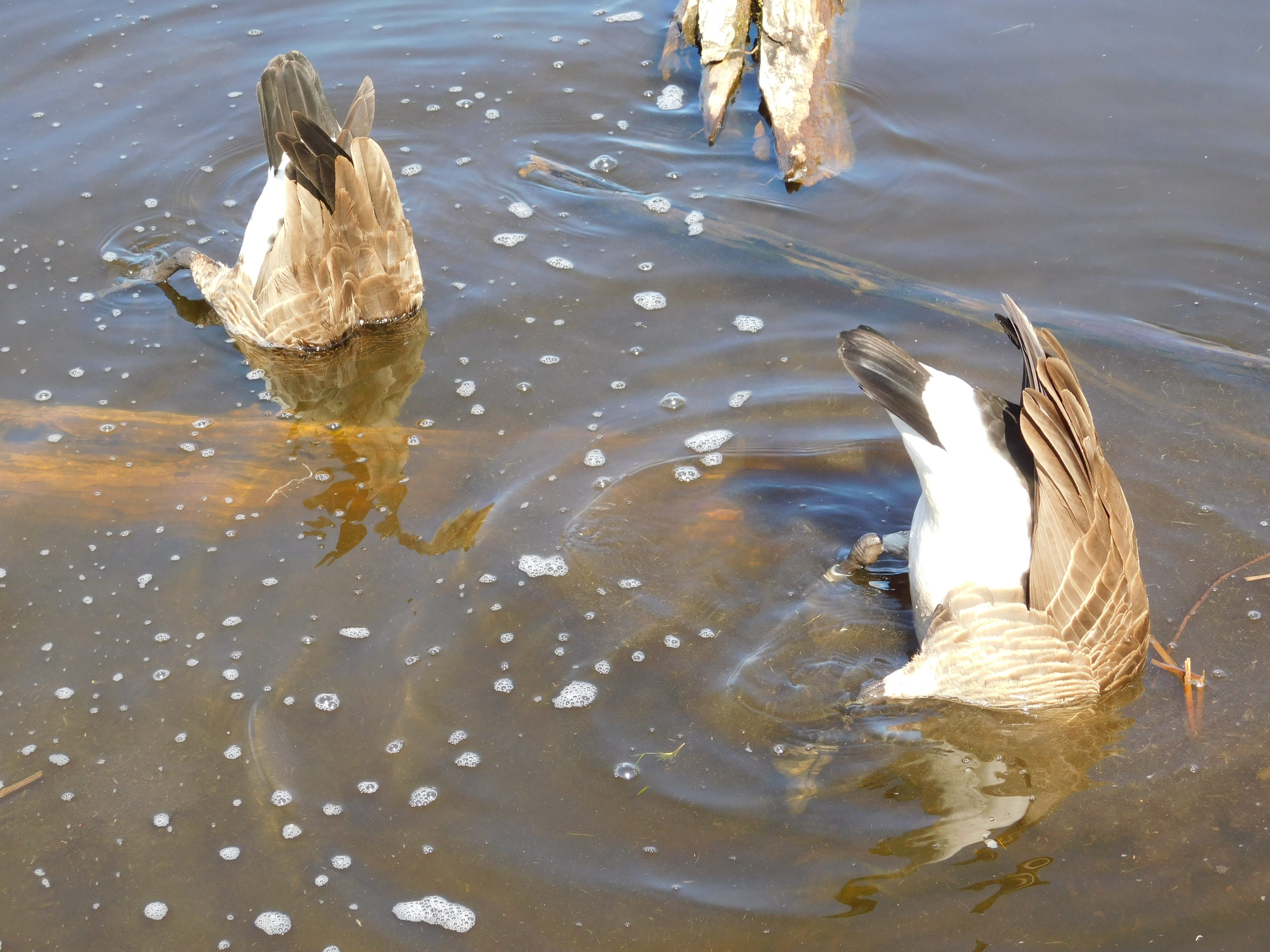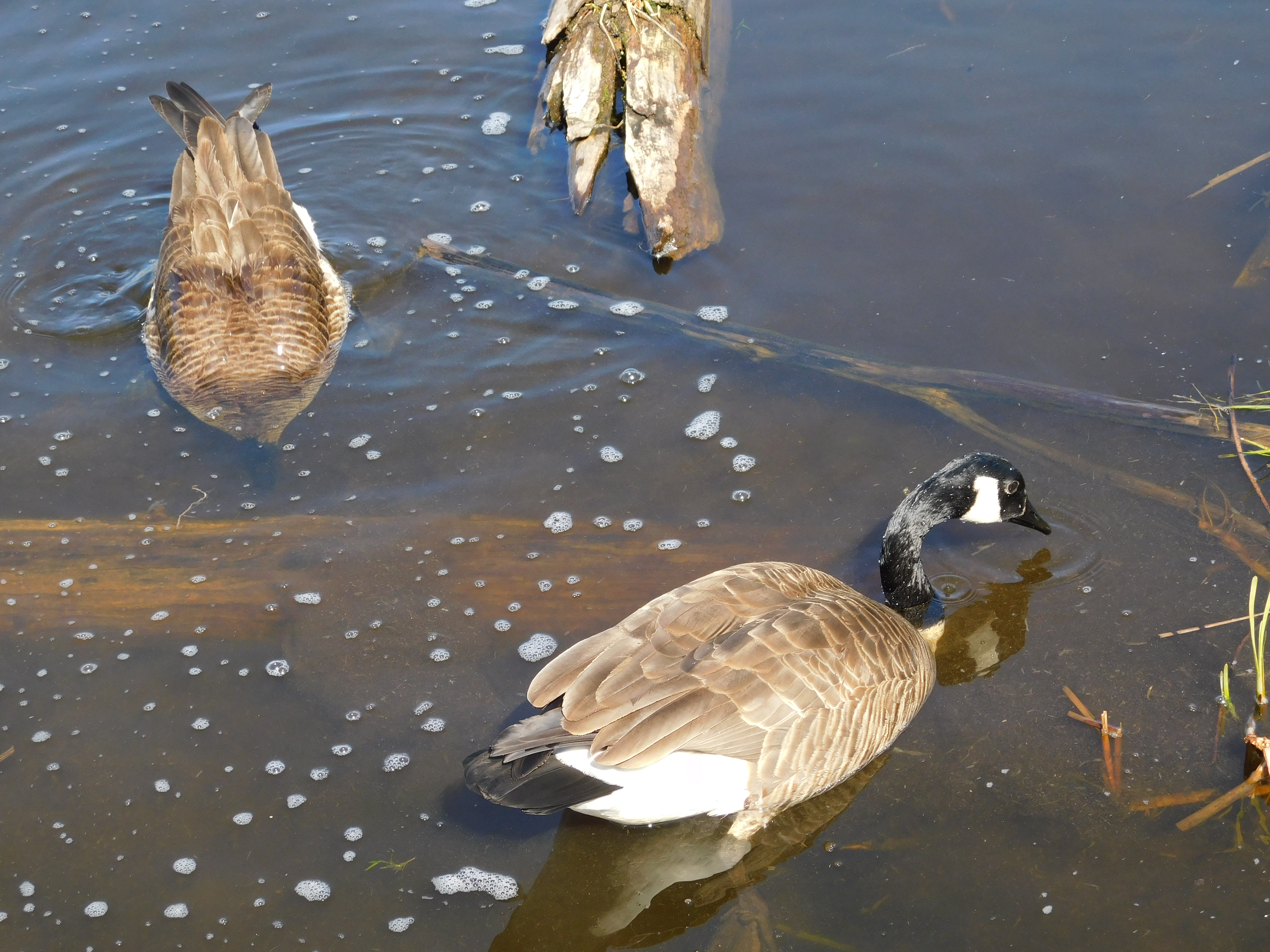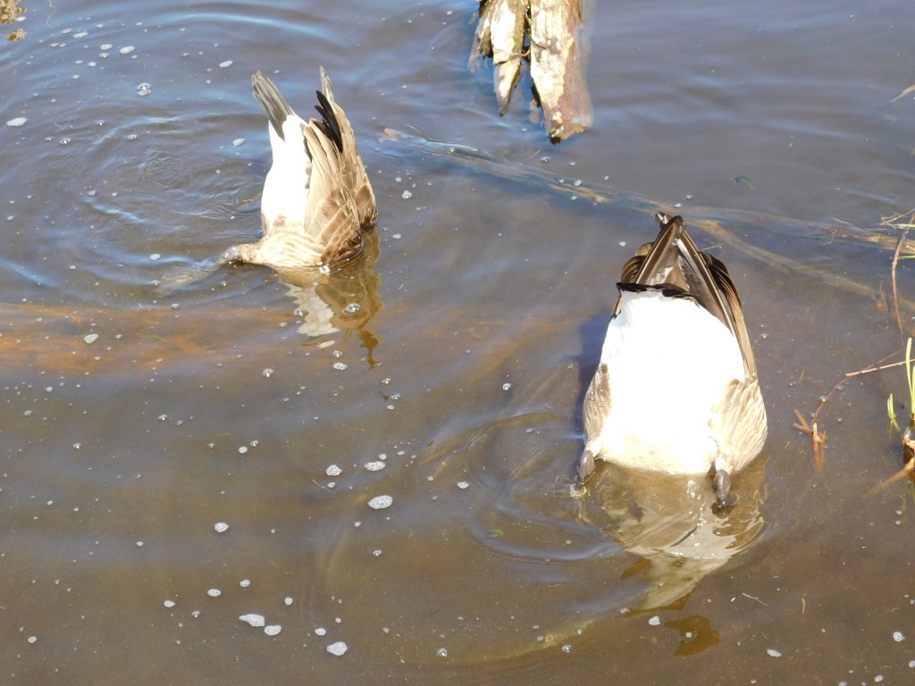 See how clear the water is in this last picture, then scroll back up to the one above, the murky water is due to the geese dive bombing the bottom and stirring up the mud when they are searching for food. They stick their little faces right down into the mucky bottom. They focus, and are very intent on getting sustenance. I’m sure these are the same two that had a chin wag with me the other day.