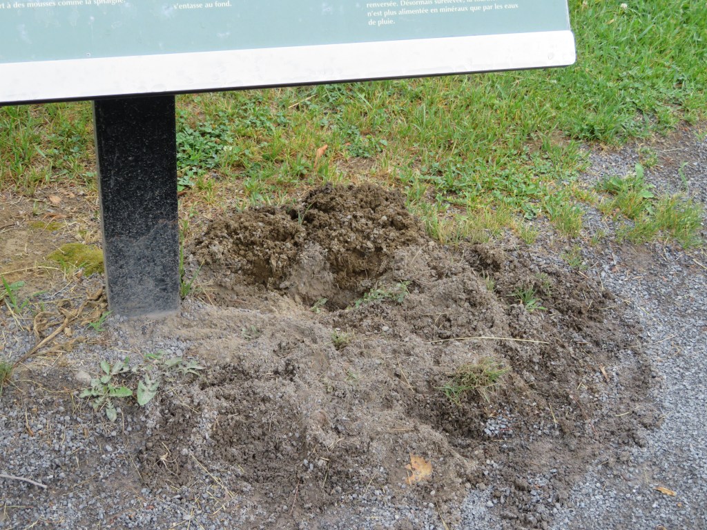 Meet the turtle I met the other day, I have since been told she is a snapping turtle, the mound of earth that she left, has since been protected by I will assume the wild life staff that monitor what is happening in the conservation area. Needless to say I was happy to see that the “nest” has been protected. I had to reposition the green warning flags, but aside from that, her place looks like it has been secured. My next question, is how will she get back to be with her eggs, or does she even care?