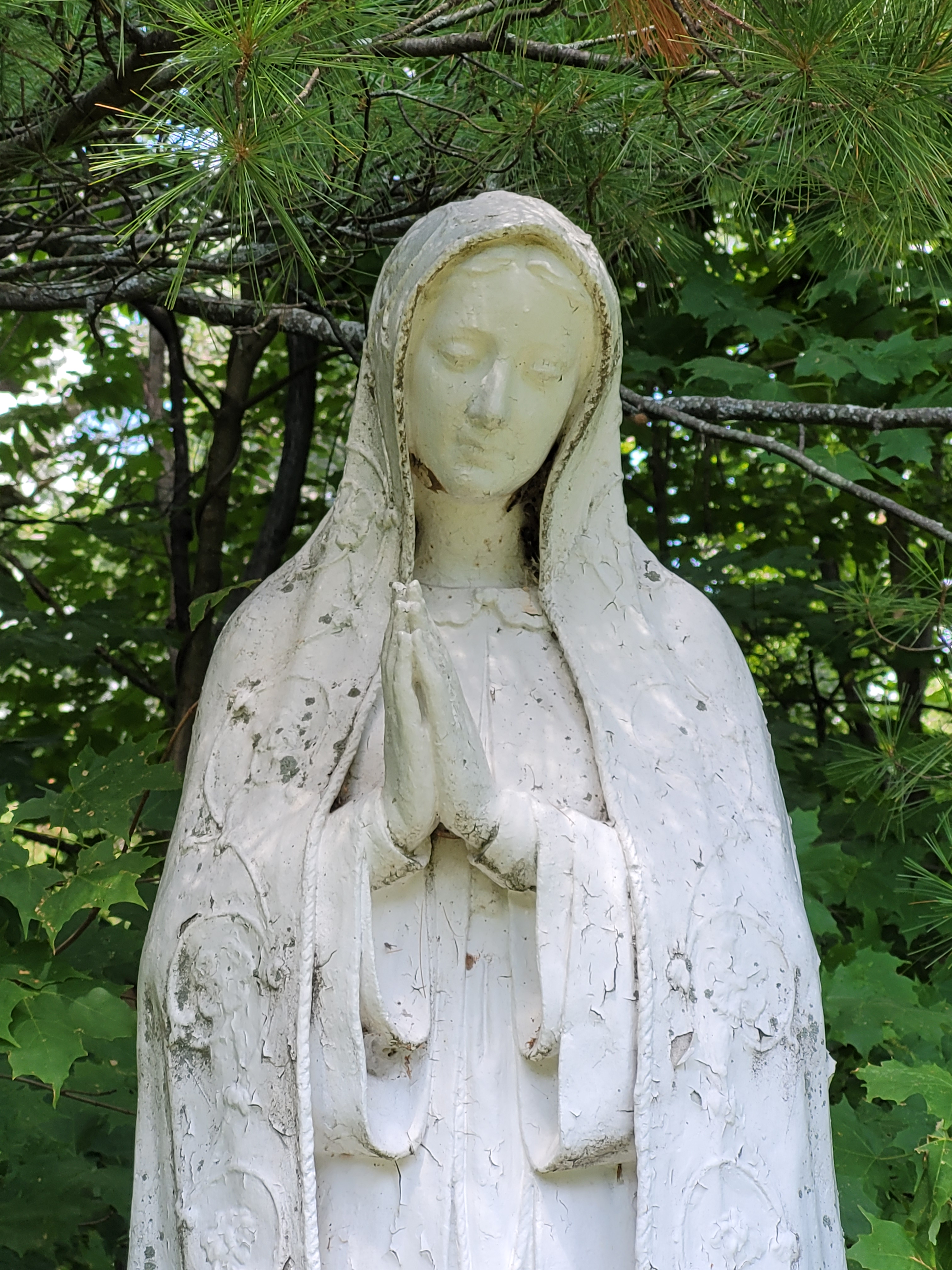 This past summer a friend and I visited a retreat where she would be doing a ceremony of celebration for one of her friends. There I saw the maze that was being rebuilt and at one end of it, was this statue of the Virgin Mary, I didn’t ask, but that is who I think it was. She had been there for a long time, still she looked so serene.