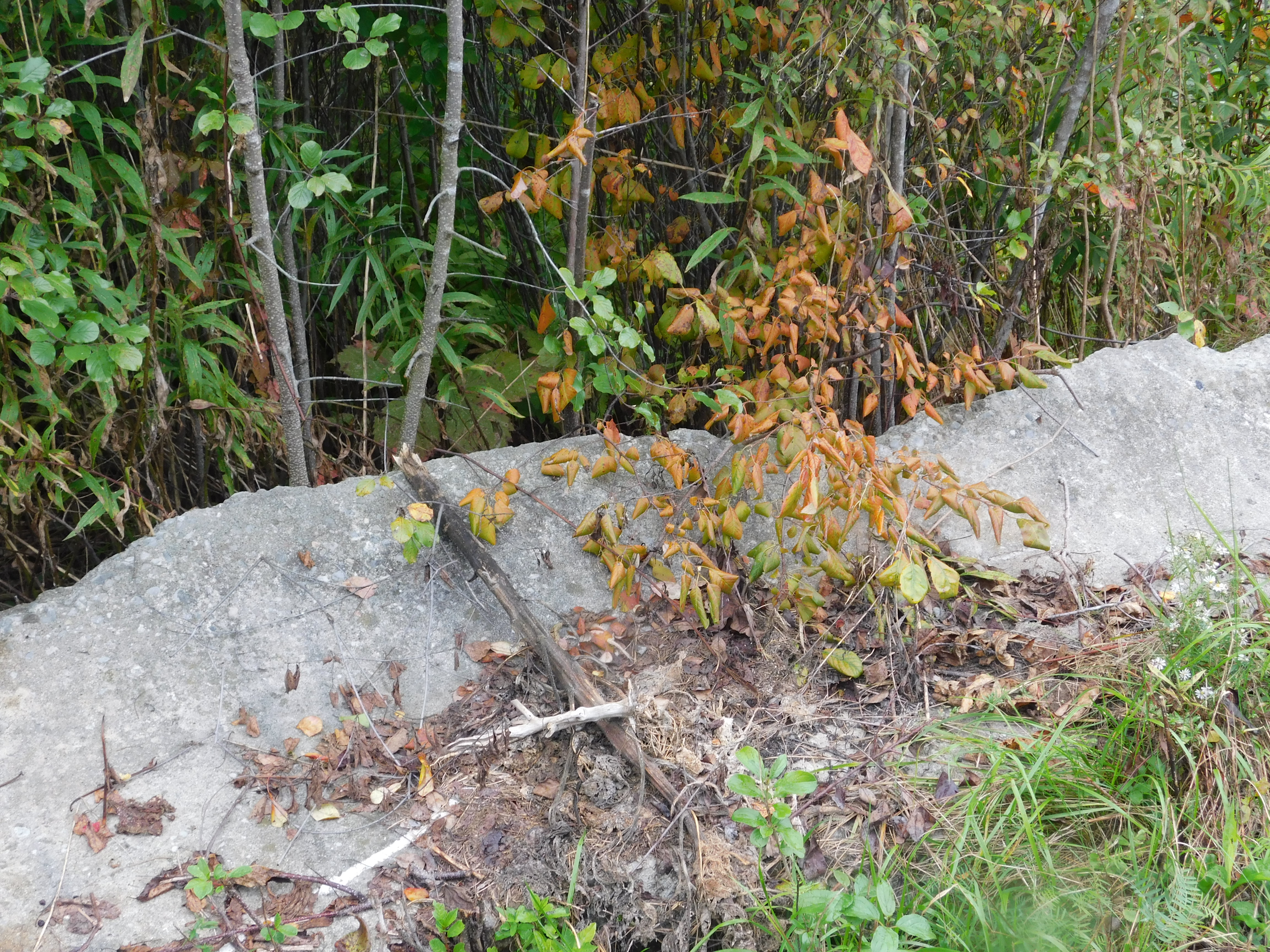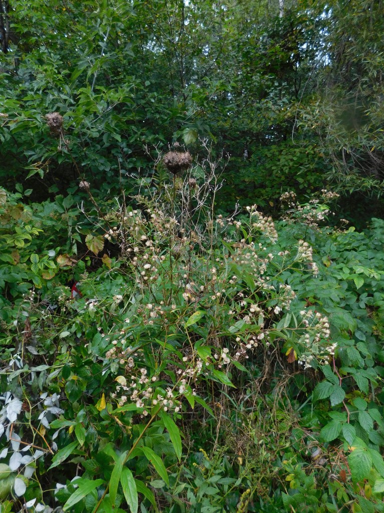 I worked my way down the trail for about the length of half a city block. Cutting and tossing the brush to one side. There is something very satisfying about doing such a physical task. There was a light rain when I returned yesterday with my camera.. so I didn’t venture down into the bush, the leaves were still heavy with rain drops. But… I will be returning.