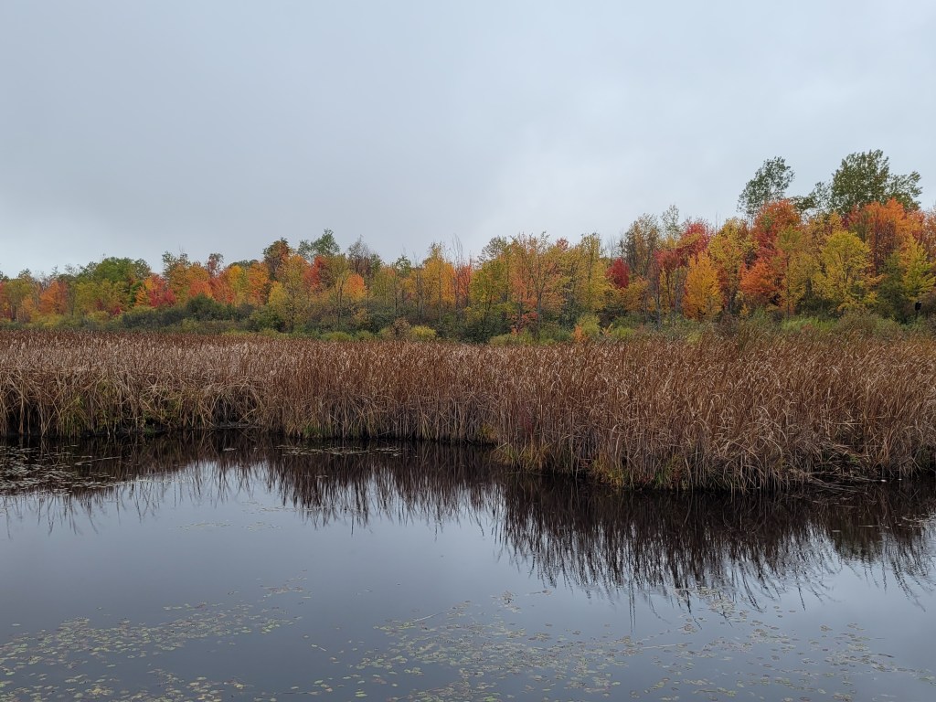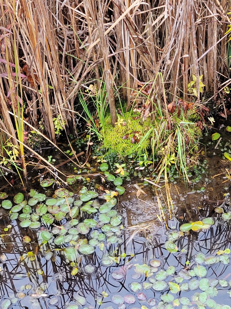 For an instance the sky clears… I see the reflection of the spiked leaves shadowed around the water plants that are smiling back up at me