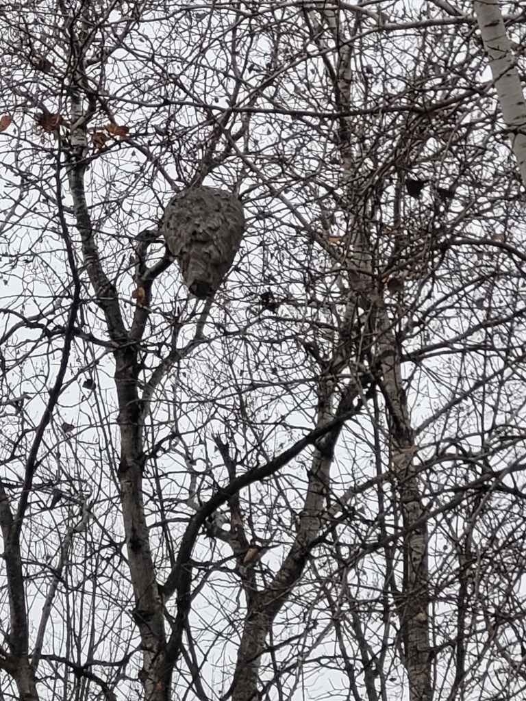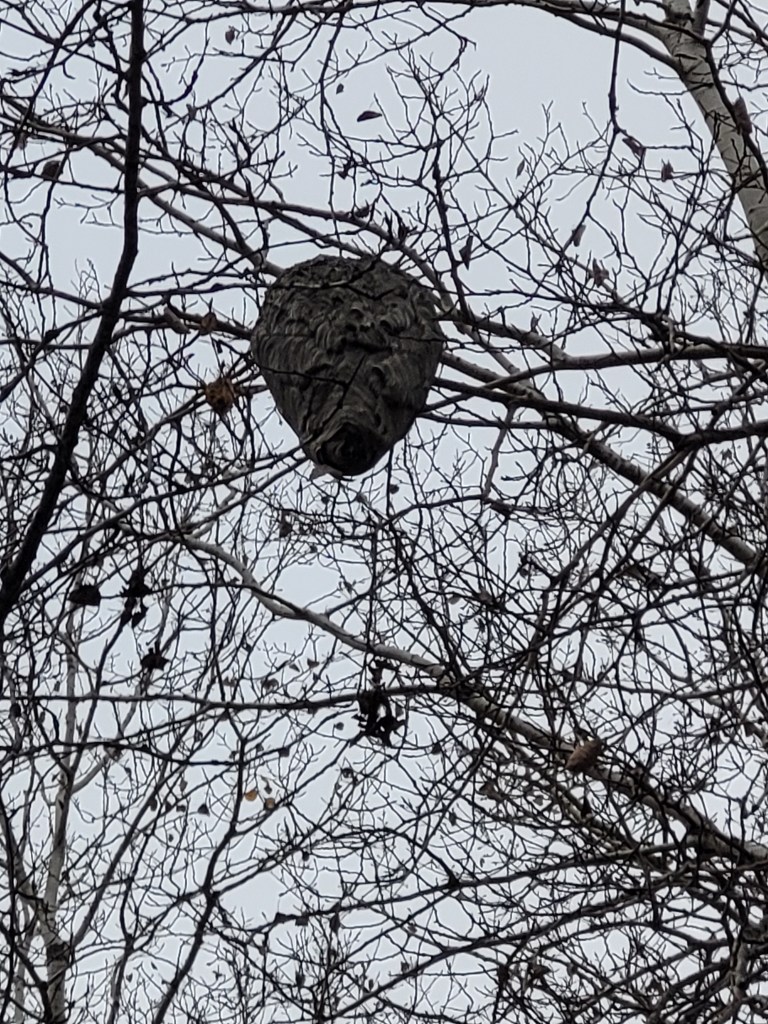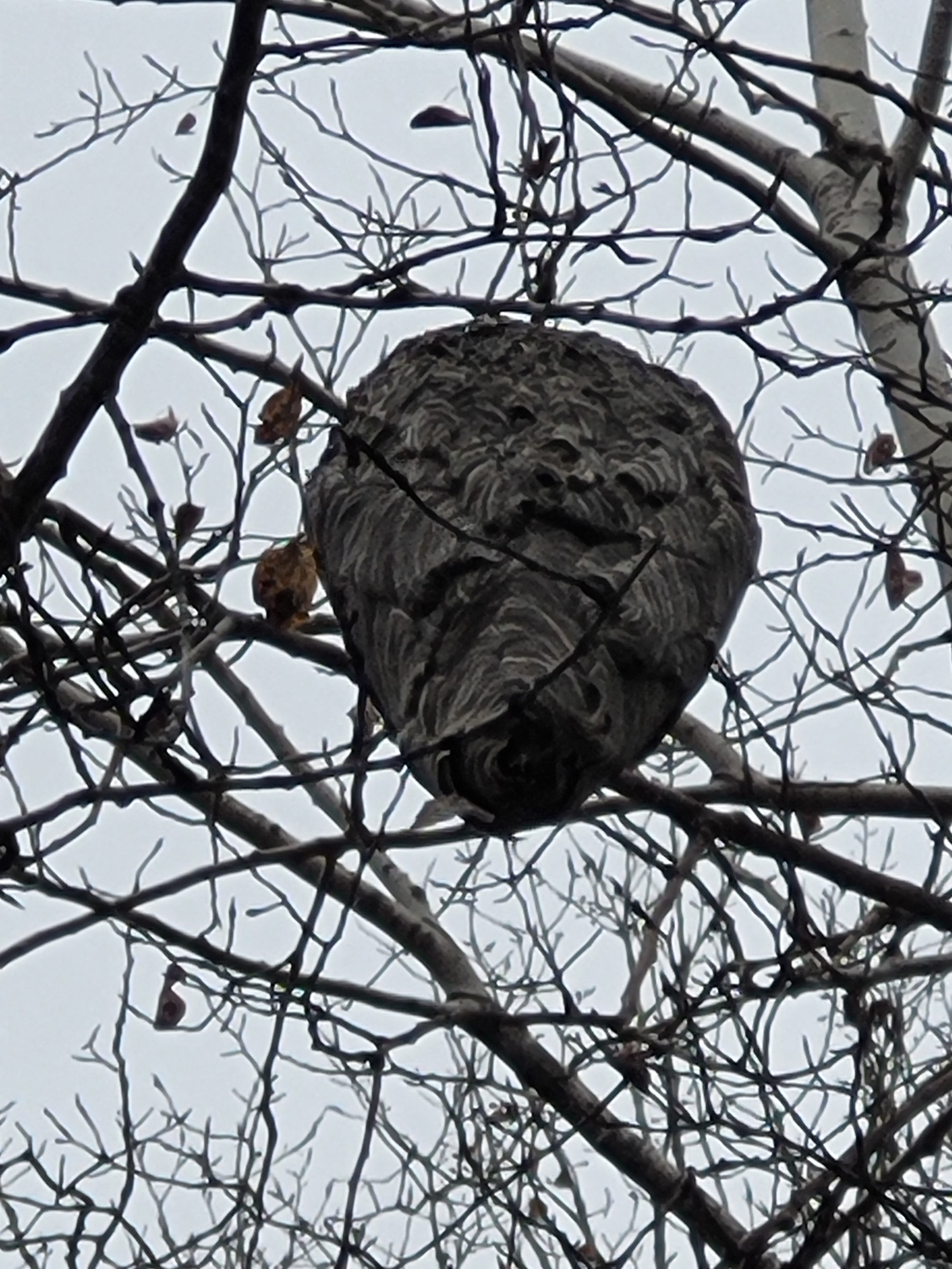 A handsome dude, for sure. 😉 Most likely a bald-faced hornet nest, all tenants long gone. Paper wasps chew wood pulp and make a kind of ‘glue’ which they then attach and build up in layers upon a branch. Though large, it is very light in weight.