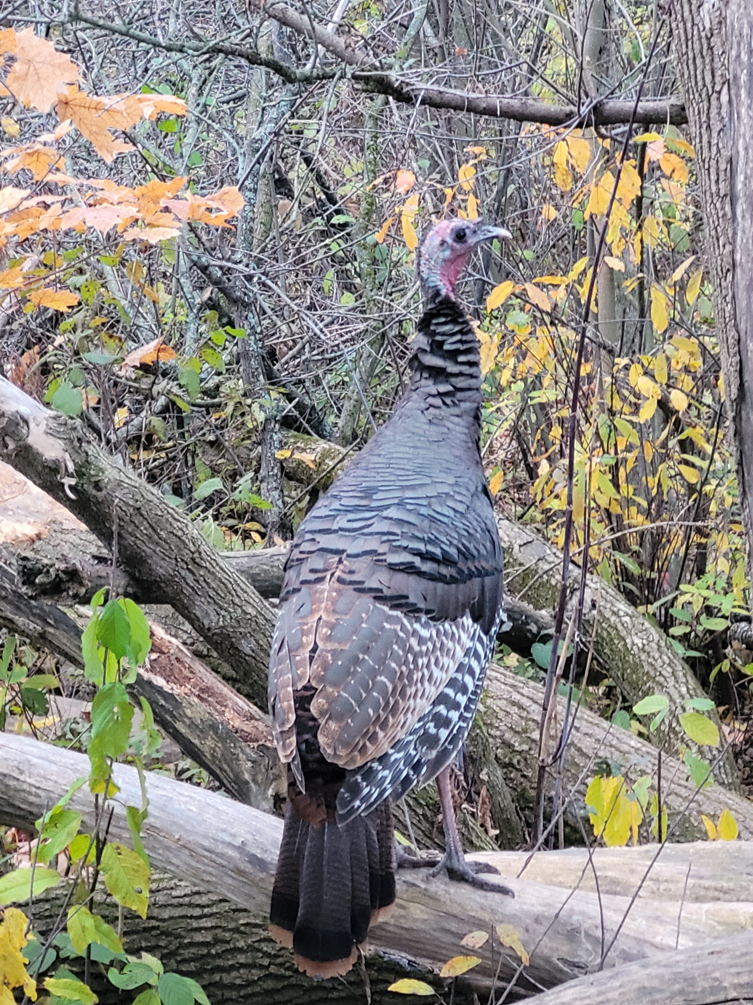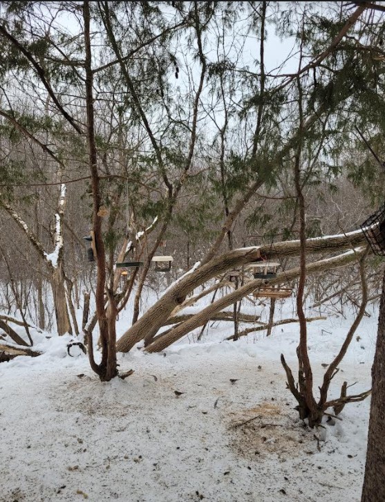Below is how the feeding area looks now… I’ve since changed a couple of the feeders but you can see the difference and the setting. (a beautiful wild turkey, I miss them.. they have gone further into the woods for the winter… )