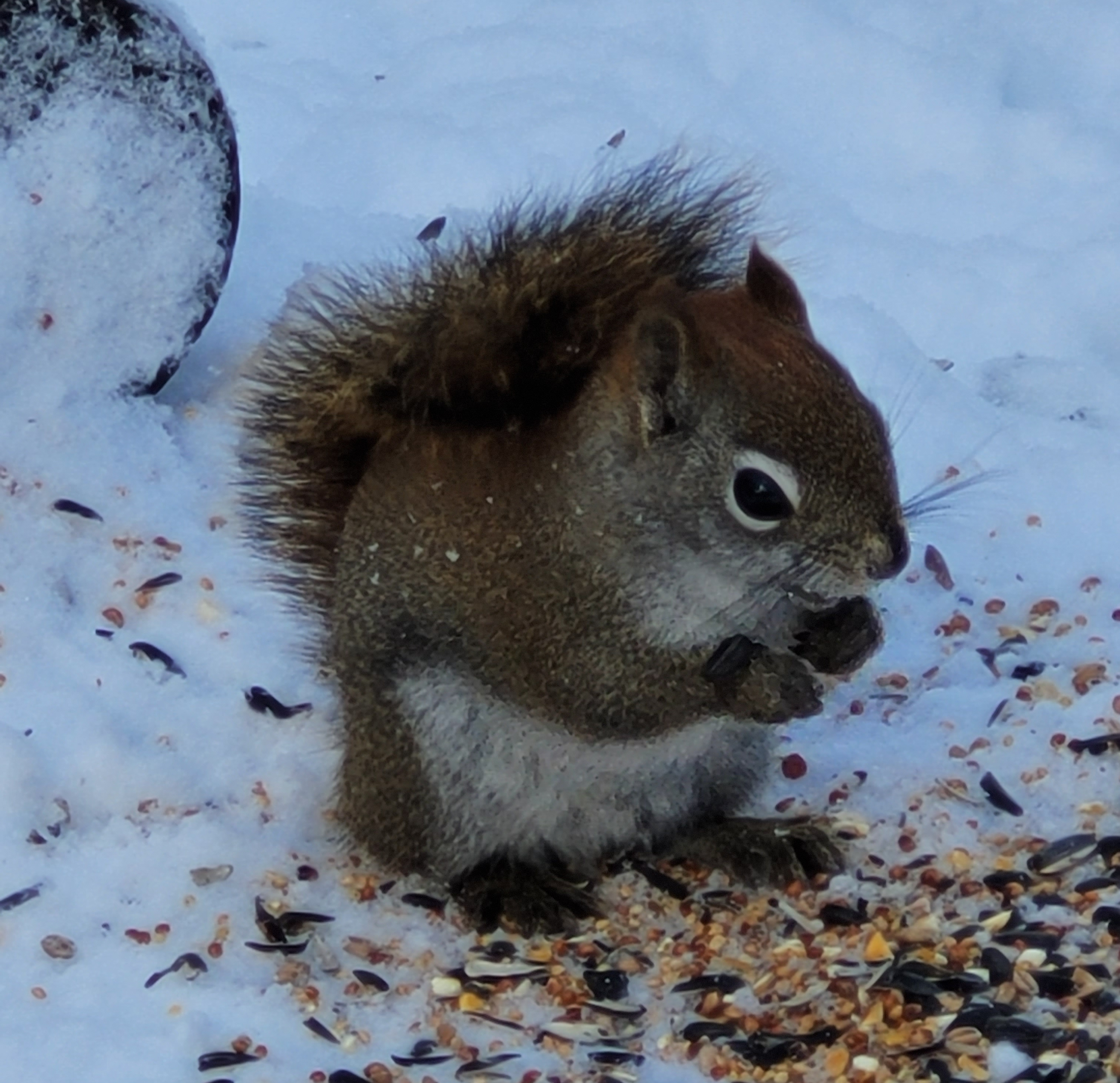 The birds were so happy to see me, they were hovering over me waiting for the scoop to appear with the seed. LOL then I had a chickadee escort service tailing me to the feeder I was heading to fill. Even the grosbeaks were nattering at me to hurry up. No sooner was the feeder cleared and seed put in, there was a gathering of evening grosbeaks all around the feeder showing great appreciation for the feed.