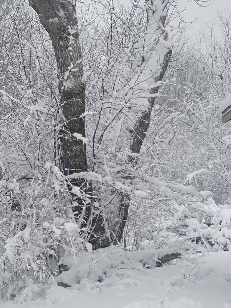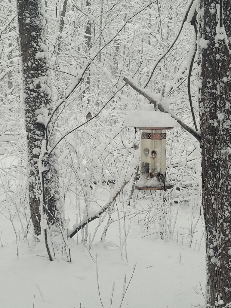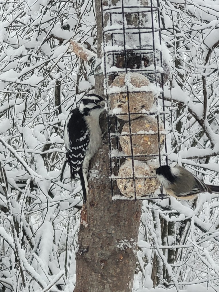 Seeing my babies tuck into the suet is all the thanks I need… the snow was falling so steadily and hard, everything was blanketed in snow. At Mer Bleue the city plow had been by to do the parking lots, but the driver although he has to drive from one parking lot to the other… lifts his blade, he does not do the roadway. I did make it to the second parking lot… where to my surprise the NCC contractor* was there shovelling a path to the outhouses. WOW… dedication for sure. I got there it was shortly after 7 a.m.
