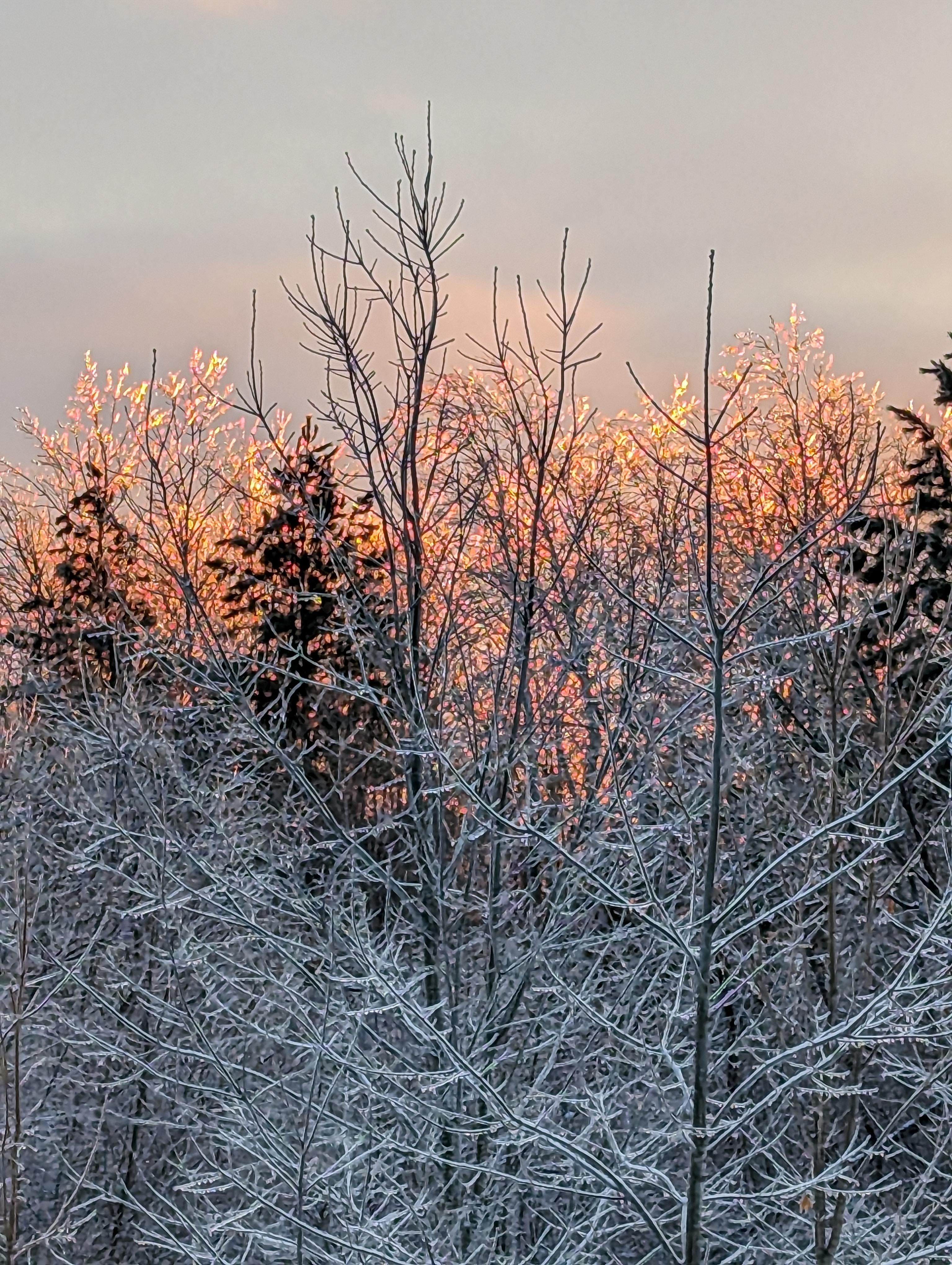The day I took this picture, there was a Nuthatch or it could have been more than one, all I know the air was filled with their song, it was pure magic. I was out of the car, I was standing by a stand of trees when the song began… it was a “stop the car” moment tho’… I stood stalk still, listened for where it was coming from, and headed to where I could get a picture. Of course without my Nikon, I got the landscape, but that’s OK, this was taken with the Pixel 7…I am just learning the phone..The one layer you can see the ice covering the outstretched limbs. then the top layer with the sun breathing fire unto the branches.. was for me a super WOW moment.