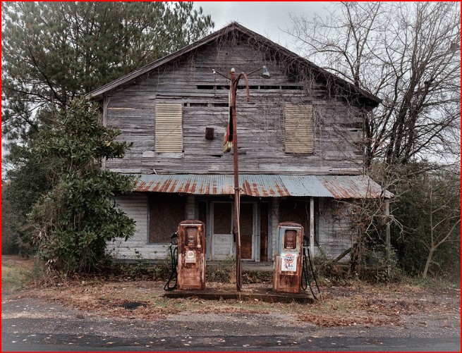 The bottom two photos, Brent Micahel (Alabama, USA) had taken the picture you see on the left, then researched what the place had looked like before it was totally abandoned. My understanding is the owners of the old service station, shared the photo on the right with him.