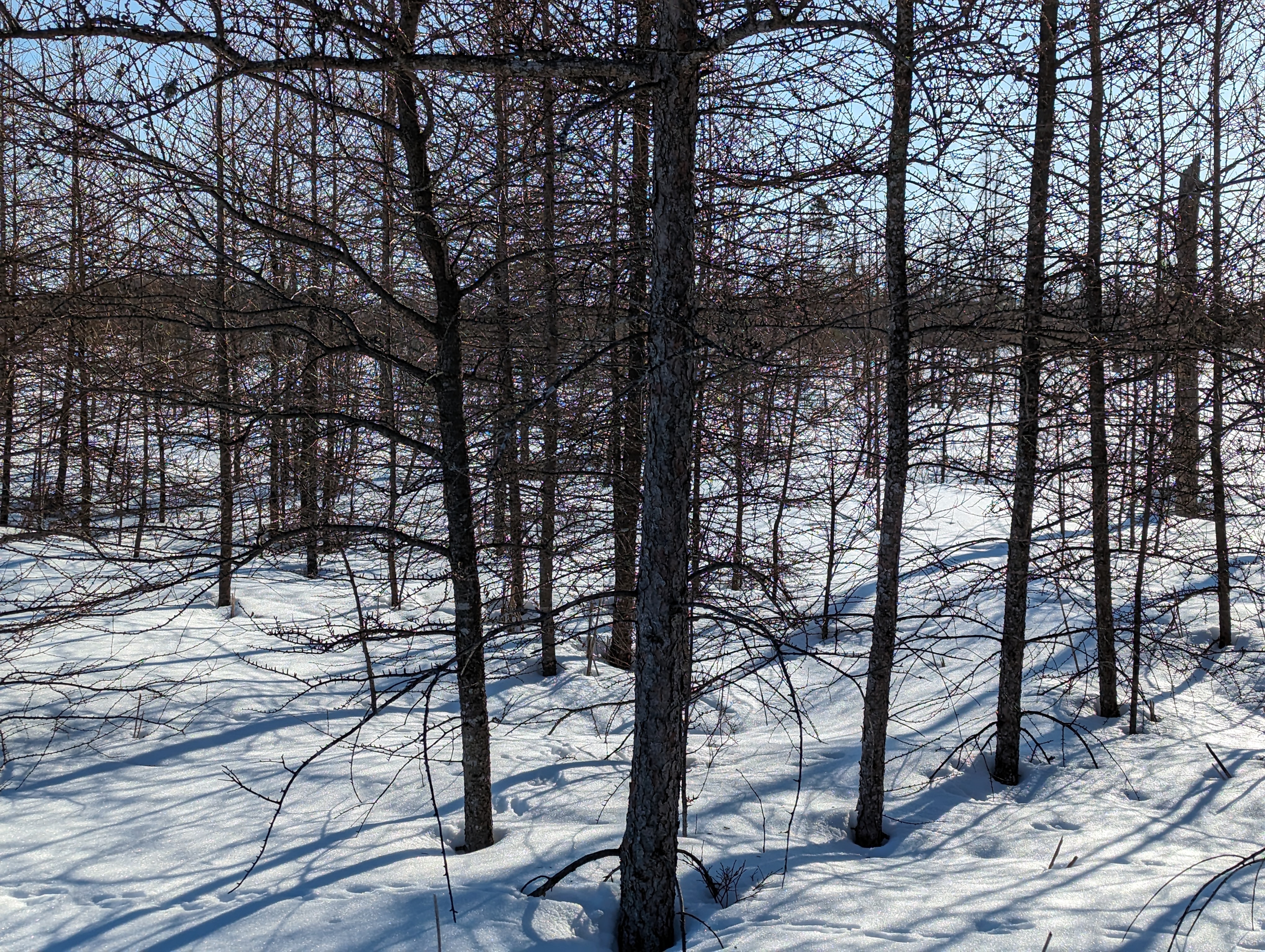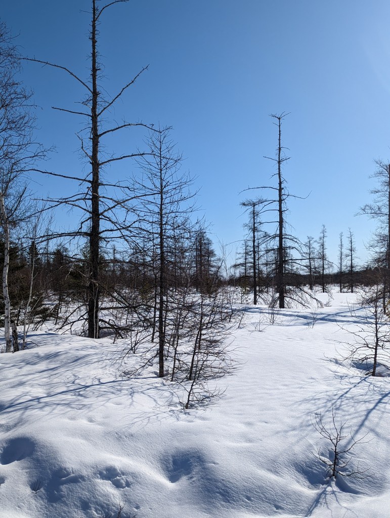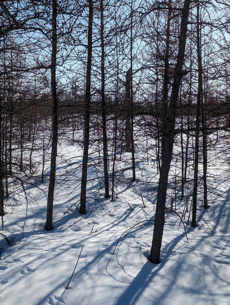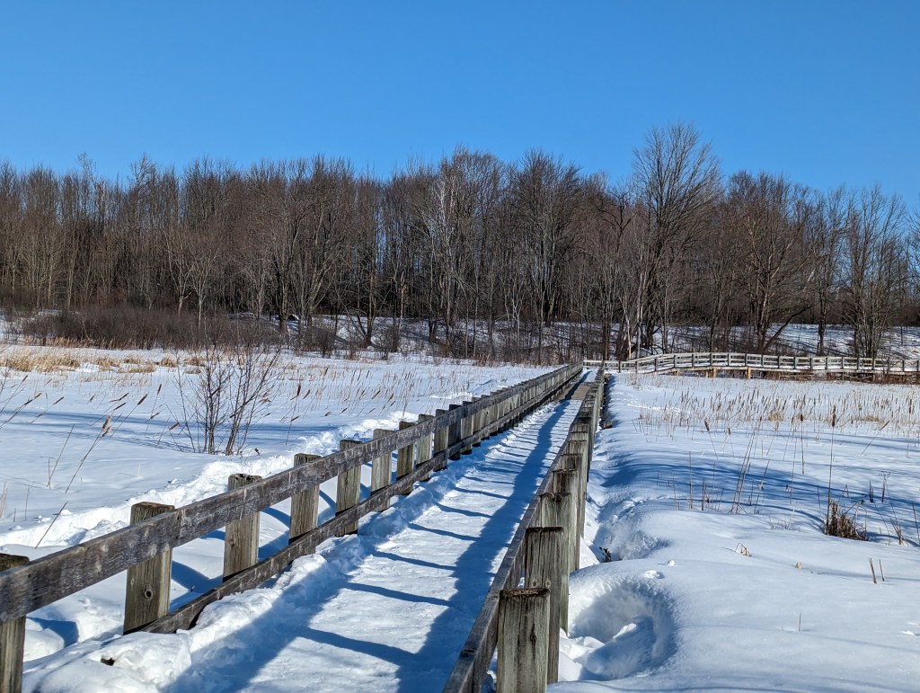 This bench is where I did my sunbathing. I cleared off most of the snow, gathered my coat around me and lay down.. closed my eyes and basked in the sunshine. There was a gentle warmth that warmed my face. I was in a happy space. It was so quiet, there were no birds singing, no little critters running about. I had the place to myself. Where was I, in the middle of a bog. It was at least a twenty minute walk to the spot where I was lying down. The boardwalk you can see still has snow packed on the boards, but with the use of my walking stick it was doable. The first bench I came to, (boardwalk photo) was totally covered in hard packed snow. Make no mistake, this area is still in its winter wardrobe.