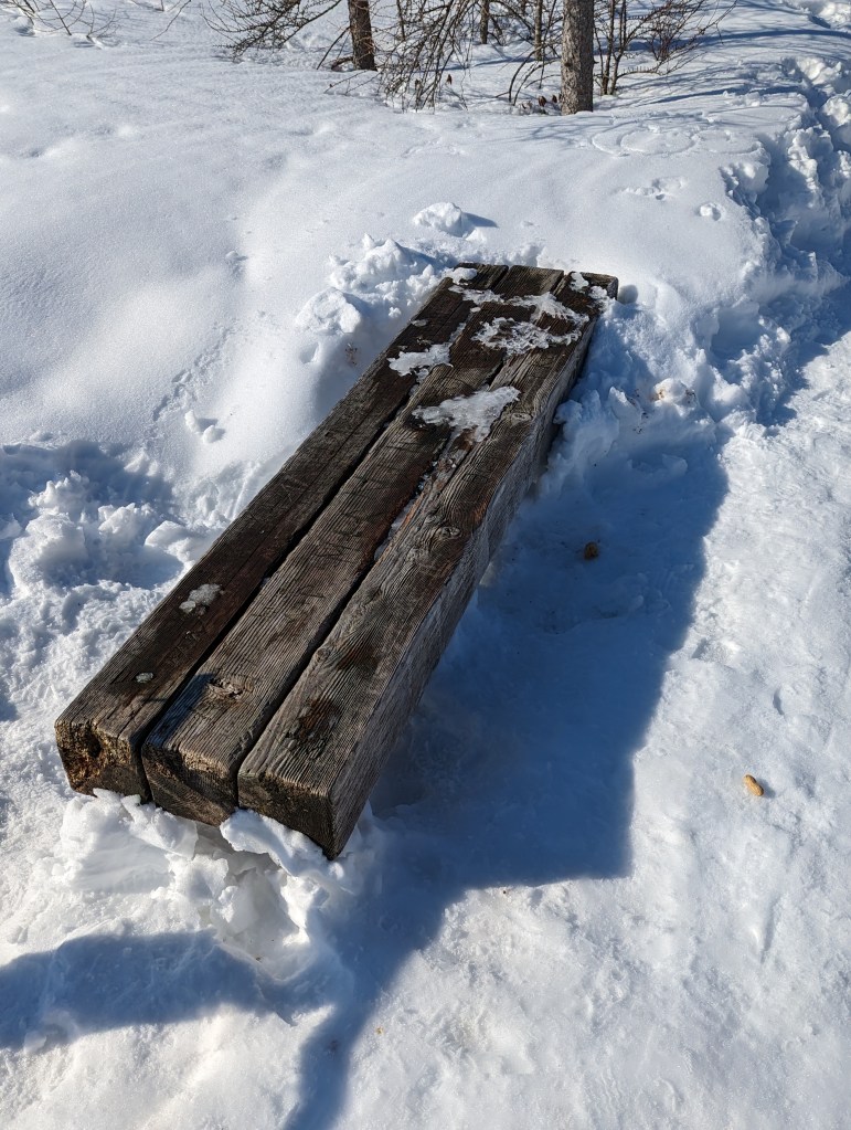 Sun bathing in winter is not something I usually do. This was a first actually. Would I do it again, yes… it was pleasant, and I liked the silence. If you look at the bench photo, you can see where I dropped a peanut in case a little critter wanted to join me.. I had no takers. What time was all this, somewhere between 8:30 a.m. and 9:30..