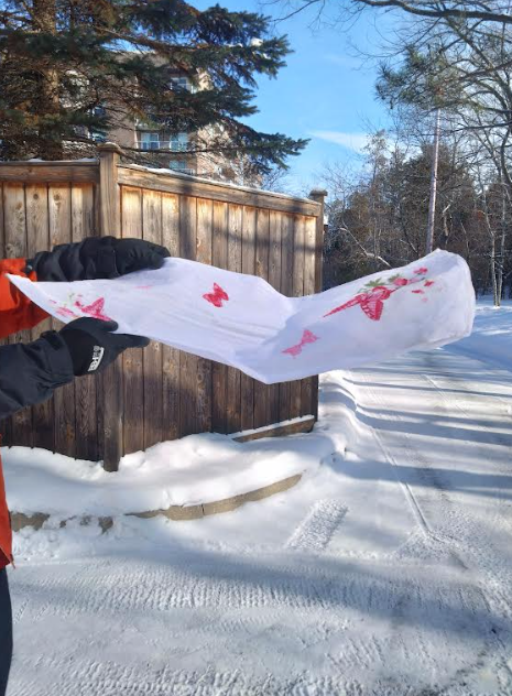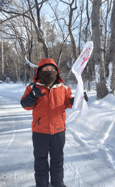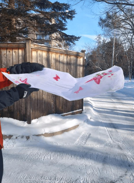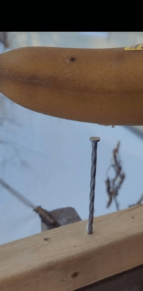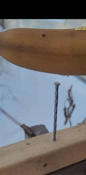 Cold you say! Here is a brave young man testing the cold.. He took a soaking wet towel and swung it in the air …in a few minutes.. hello… frozen towel… the last picture, his big success, was putting a banana out in the cold, leaving it out overnight till it froze… then using the frozen banana, he hammered that nail you see into the board. Who says we don’t know how to have fun in cold weather.!!!