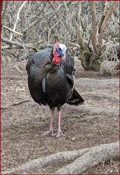 The blue jay was not going to be intimidated.. you can see his blue behind the wild turkeys who once they discovered that there was “food’ on the ground, were not keen on moving off or away. They ran off at first, but one plucky one turned back to see just what was being offered. Once he discovered this was a mega of food, he applied himself to the task of eating all he could before the others realized why he was not following them.