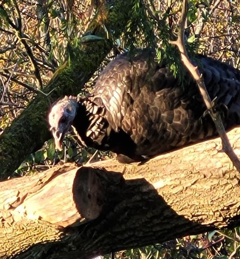 This wild turkey surprised me by hopping up to the branch that I had just buttered with the suet the woodpeckers and smaller birds love. He was not going to be left out. It was high off the ground, I have to stretch to butter the crevice, but that was not a problem.. I turned and there he was we were face to face.