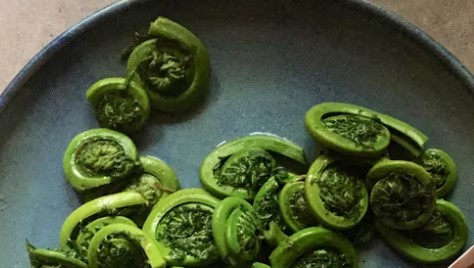 What I came away with was a HUGE craving for steak med. rare with a side dish of fresh fiddle heads. So much so, I cut my “walk” short and headed for the local fresh fresh grocers (Farm Boy) Came home, seared a steak, tossed a salad of greens and shrimps, with a side dish of steamed fiddle heads with melted butter..
