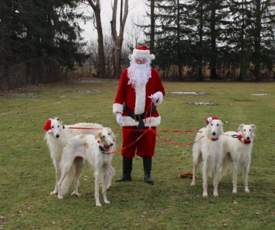 Borzoi hounds waiting for Rudolf … they are on standby in case the snow fails to make an appearance. Rudolf promised Santa he’d give them a briefing .. just in case.