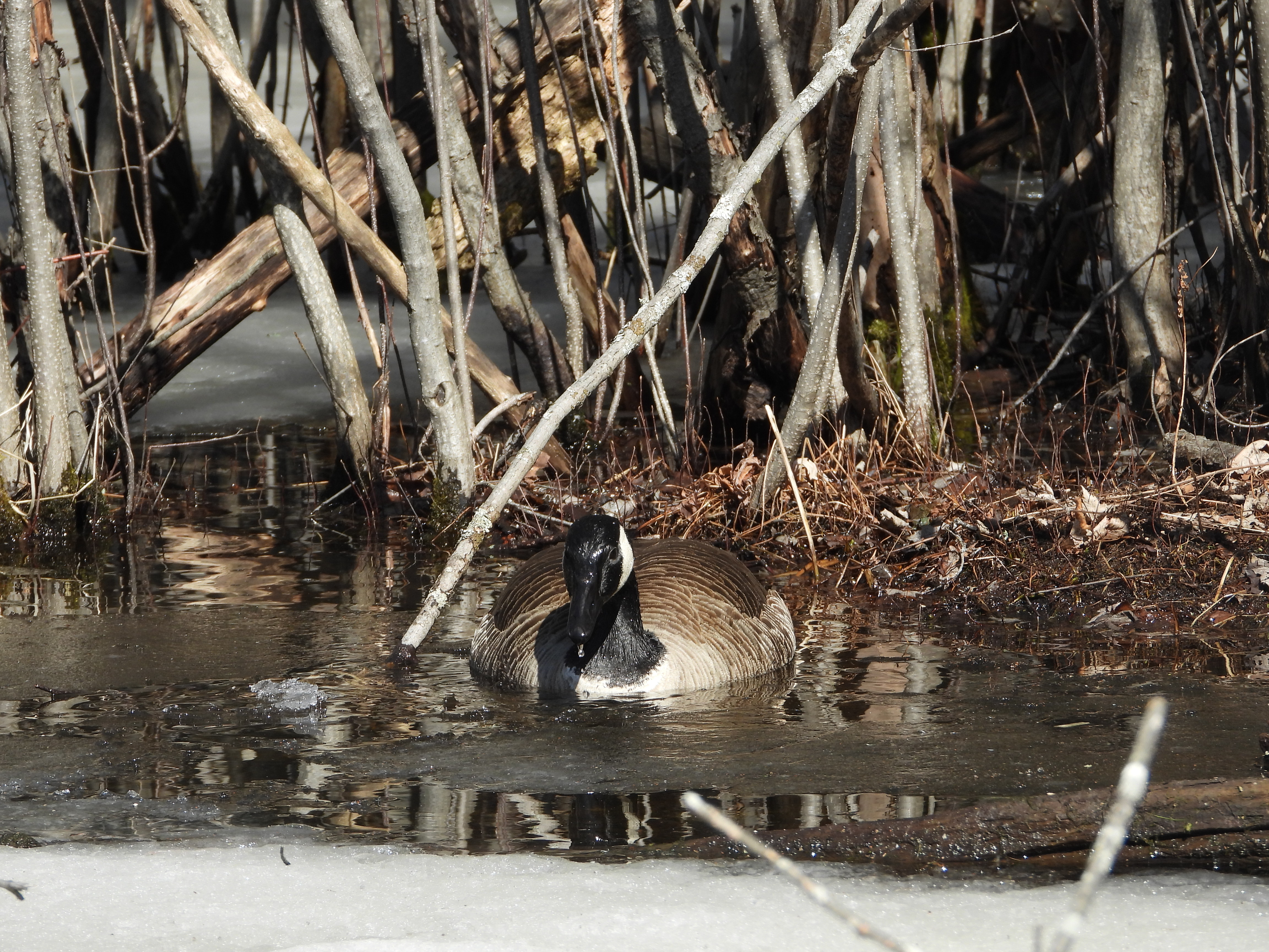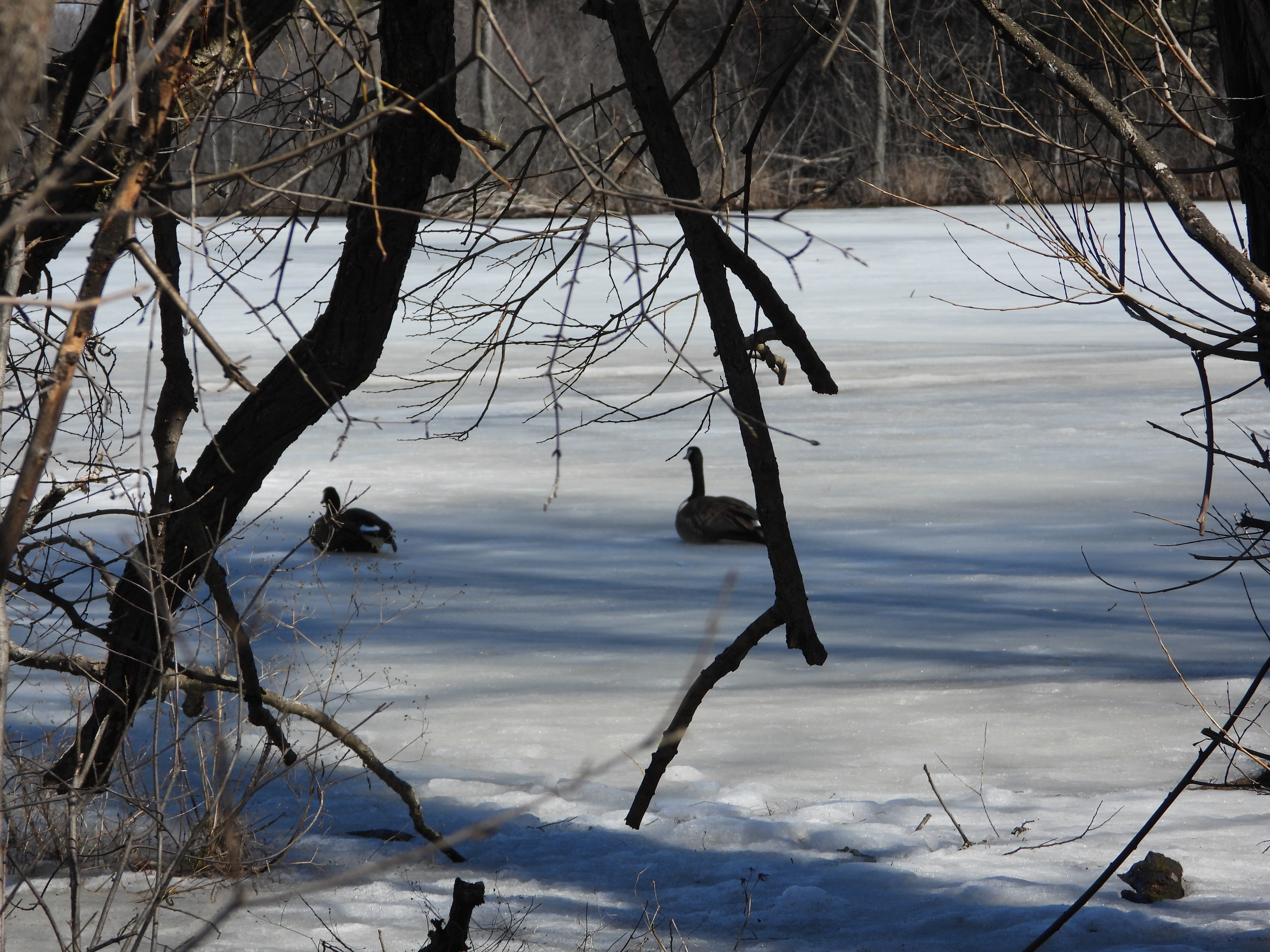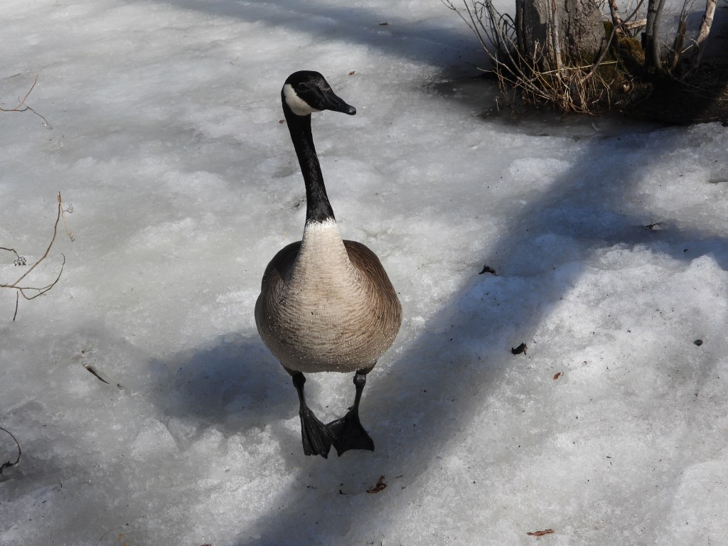 It is mating season, believe me you have never heard a demanding aggressive bird until you hear a Canada Goose defending its turf. They race across the ice, necks extended and give off the most abusive sound. I was glad I was an observer and far from the angry male …