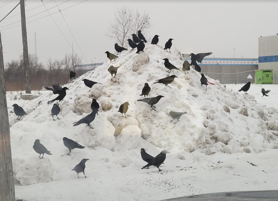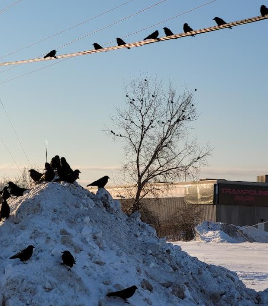 This picture is from 2021… the snow was too high, visibility too poor for me to even get a picture today, but this is how the crows were lined up waiting for me to get to them. I had to park away from the area I usually drive into.. snow was too high, it was impossible to see where one could get out once in the area. I parked and hiked in… they watched my progress with rapt attention… cawing and calling out encouragement as I stumbled over a cement edging that was unseen under all the snow.