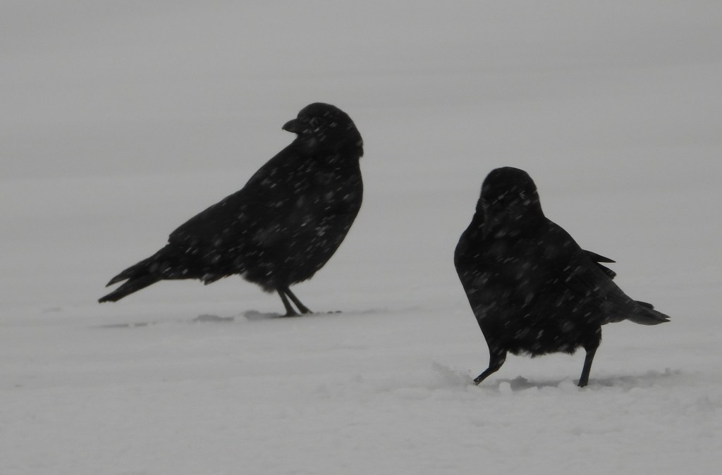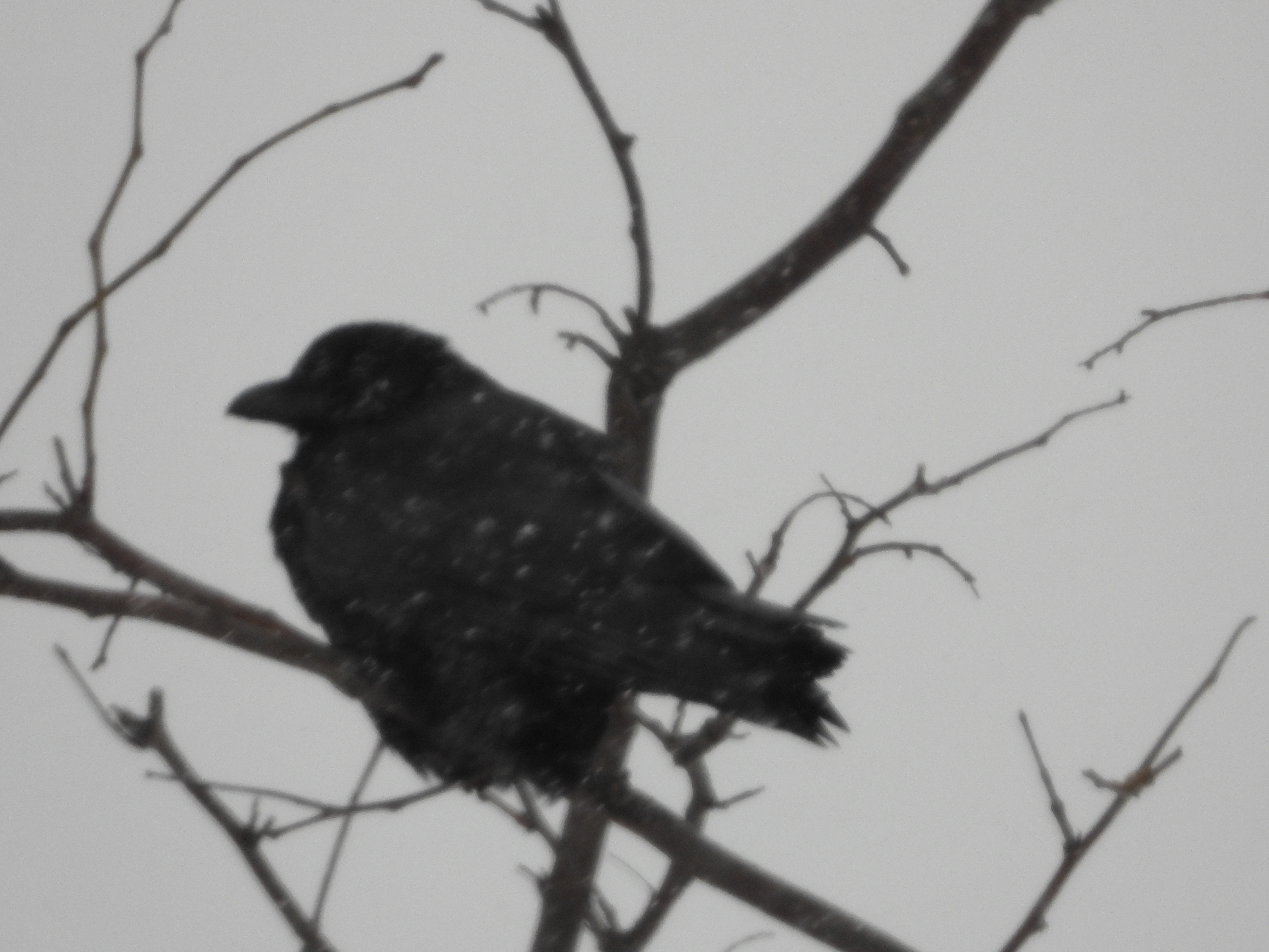 Heavy snow made it hard to see much, I basically decided it would be best to not attempt too much driving. When I left snow was falling lightly, but by the time I was back where the crows were, it was falling heavily.. temperatures were such that ice formed on the windshield blades.. and crusted on the windows making it hard to see.. the wipers left big crushed ice arcs just where I needed to see the road ahead. I had my Nikon today, didn’t do me much good tho’ you can see the snow was falling so heavily it was like trying to get their picture through a shower curtain of wet sticky snow.