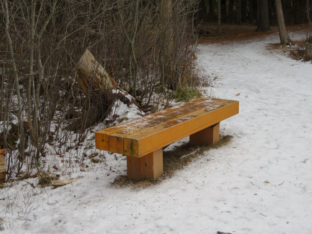 The bench you see above is at one of the conservation areas I go to. I pass it often. seldom do I take advantage of it.. I prefer instead to walk a little further and sit on one that is further in the woods and often secluded and shielded from the other visitors to the centre.