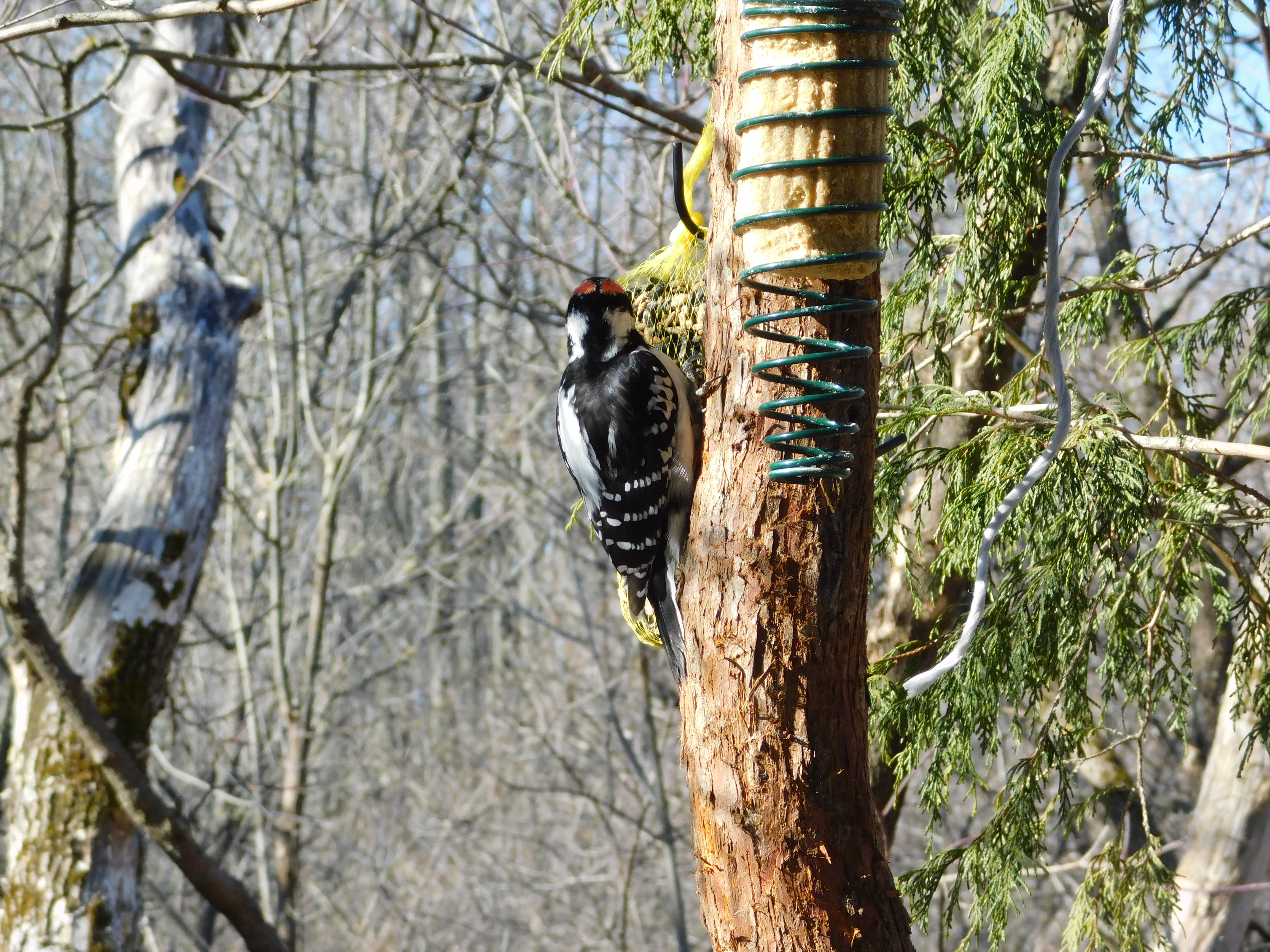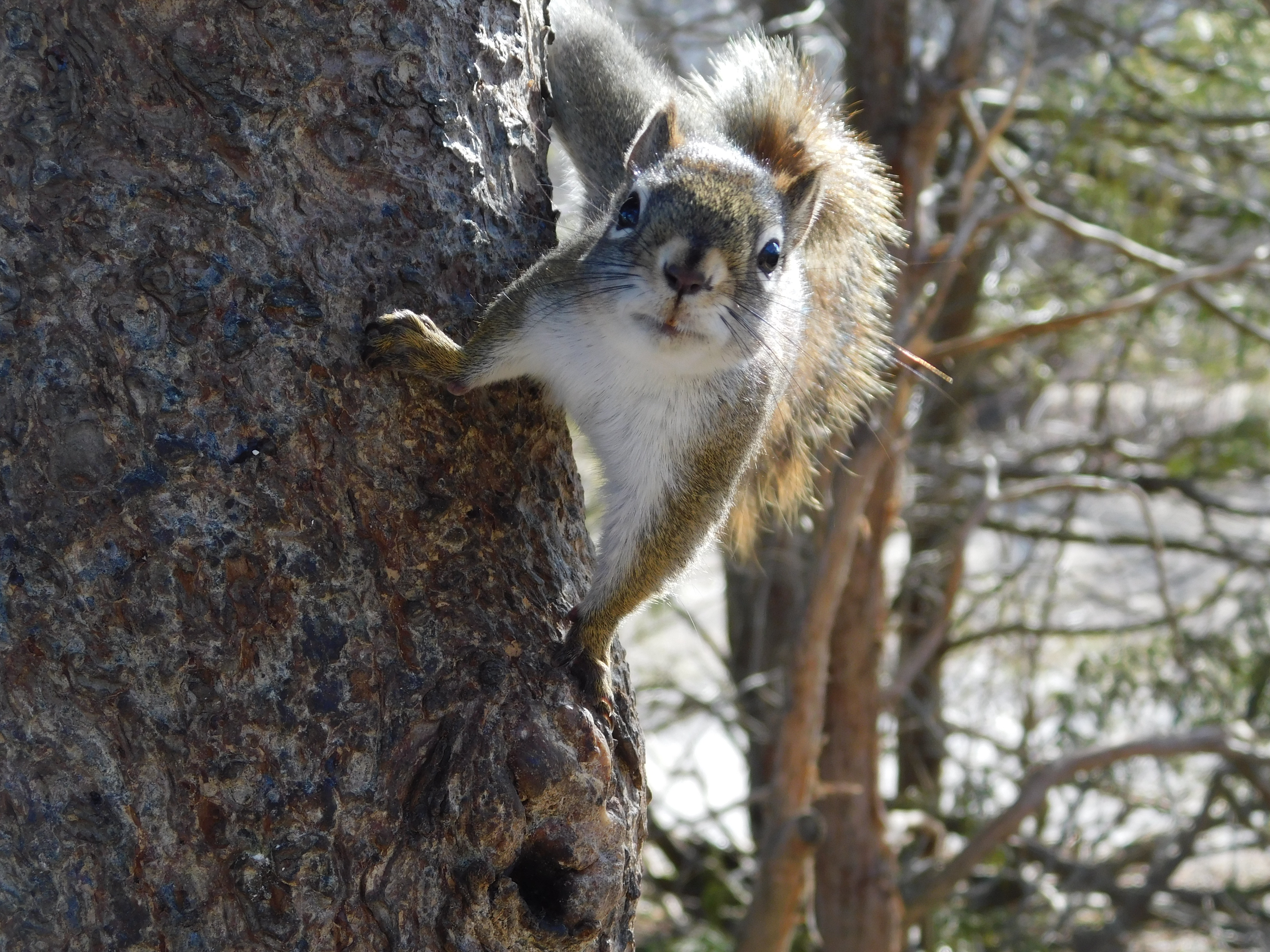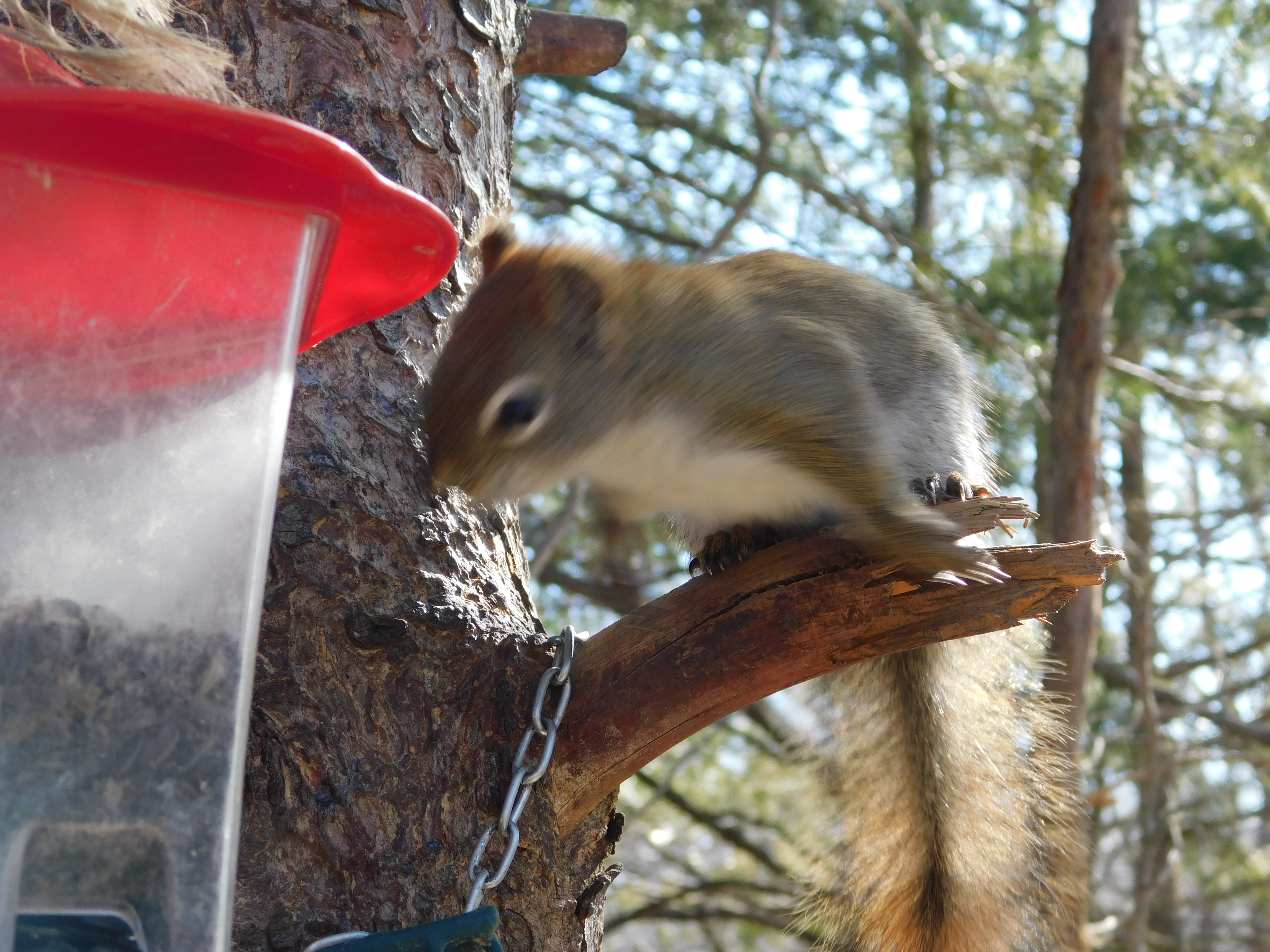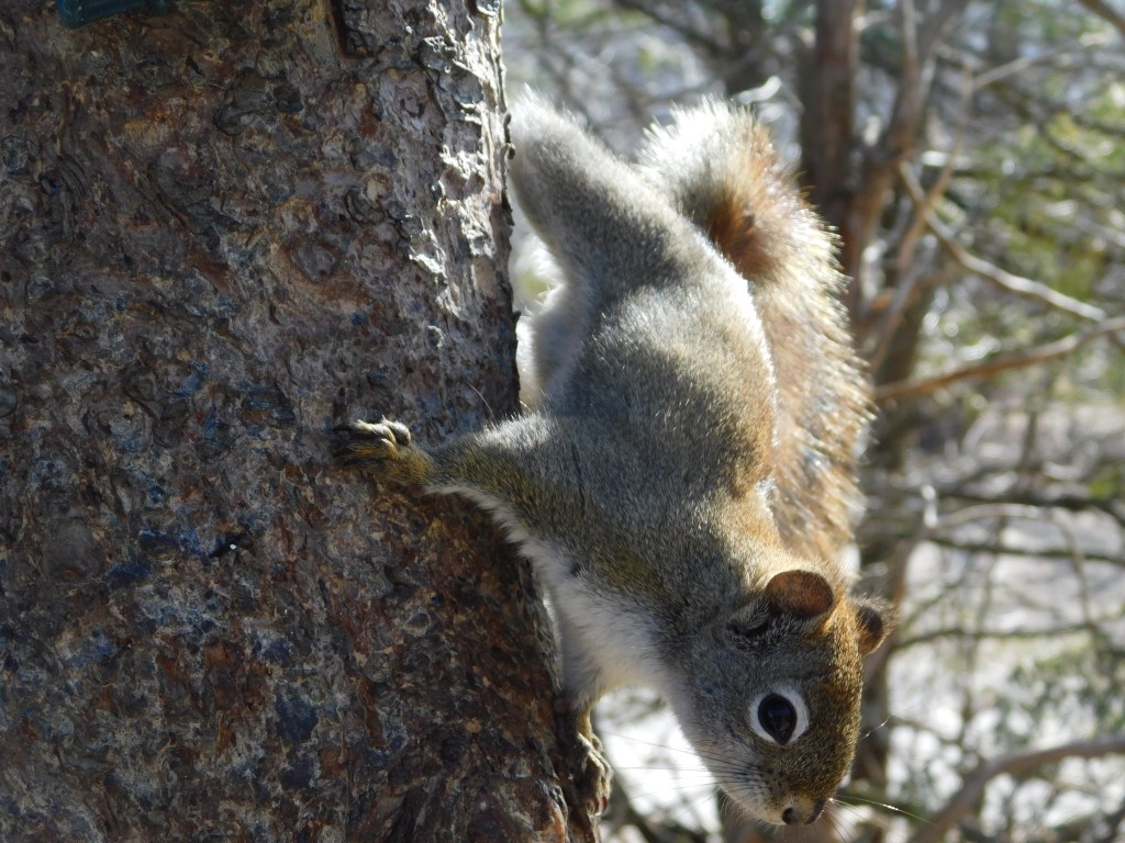 Good morning, thought I’d share my “gym” with you today. I thought it could be a squirrel, but look at his little hands, I now believe him/her to be innocent of thieving. I arrived one morning to find that one of the cylinder feeders was missing from its placement, I was perplexed, I had (I thought) secured it rather well to the tree with rubber coated wire. (this protects the tree bark)… On inspection I saw the green feeder under the bramble in the bush .. see bottom right picture. I could see it but to get to it I had to maneuver the big trunks …The first time it happened, Tanya arrived for her daily hike, … and helped me retrieve it. For her, younger and more agile she went along the side of the big limbs squeezing along between (see picture to the left of the one you just looked at….. She took her time and the feeder was retrieved.
