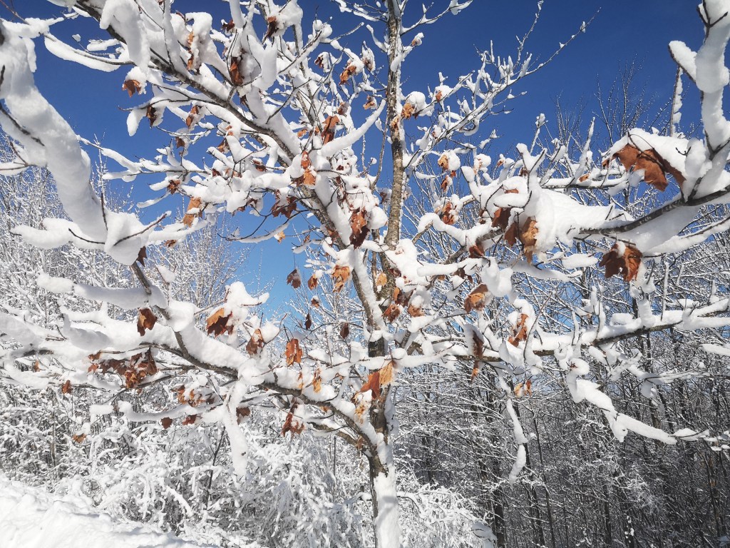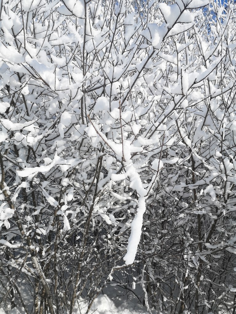 It was a sugar coated world yesterday . Mild, very pleasant. There is a simple joy in standing quietly while the fluffy snow flakes dance merrily through the air. Of course if I stood too long, there were complaints from the peanut gallery that the morning breakfast was being delayed. Interestingly when they see the chair and I sit.. they stop chastising me and go about cleaning up their “plates”… they seem to know, when the human sits and closes her eyes, I’m having a ” time out”.