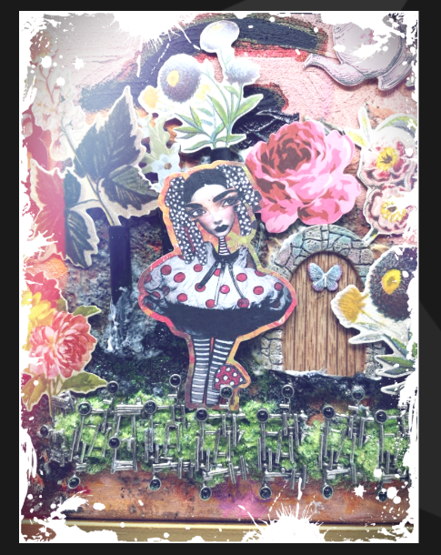 yes, there are pieces of pewter, semi precious gemstones, glitter, and a mini door… let me see pipes, ephemera,doll cut out,canvas, the lists just goes on. I can also redo it, not all of it is permanently put down. Who knows, I might eventually finish it, and present a totally different look to you. muah!