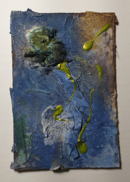 While drying it took on the look of a wet rose. Of course the ultra matte gel used to sculpture it in place, changed the effect somewhat.. but in person, I can still see the outline of my rose. My lion is in the pieces of discarded paper that I ripped up from some notice or other… and layered it in a rolled ball that obviously flattened and mushed around. it is the Distress oxide inks that shade the papers that gave my Lion its life.