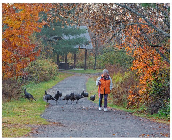 It was cold .. I’m layered with a long sleeve sweater, quilted vest an outer denim vest and then my rain jacket. Wild turkeys following my lead back to the feeding area. (7 a.m. ish)